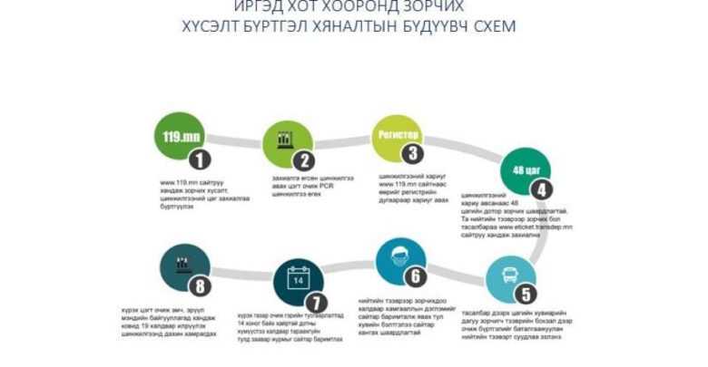 1. Иргэн та цахимаар www.119.mn сайт руу хандан Улаанбаатар хотоос орон нутагт, орон нутгаас нийслэл хот руу болон аймаг, сум хооронд зорчих хүсэлтээ бүртгүүлэх, шинжилгээ өгөх газраа сонгож, цаг товлоно.