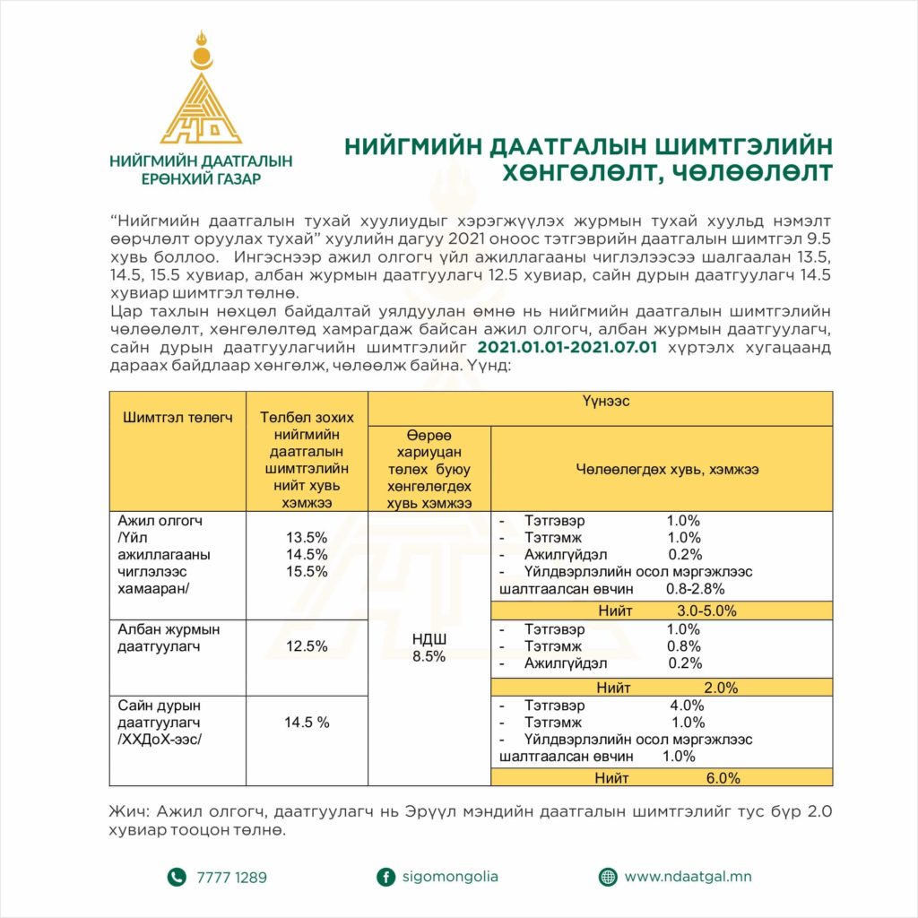 Нүүр /Нийгэм/2021 оны Тэтгэврийн даатгалын шимтгэл 9.5 хувь боллоо НийгэмОнцлохШинэ мэдээ 2021 оны Тэтгэврийн даатгалын шимтгэл 9.5 хувь боллоо ТагНДШ