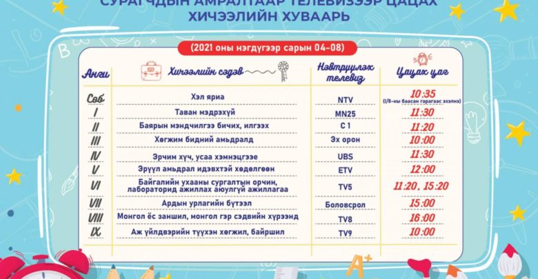 Монголын телевизүүдийн холбоотой хамтран 2021 оны нэгдүгээр сарын 4-ний өдрөөс бага, дунд ангийн сурагчдын амралтад зориулсан “ТЕЛЕ ХИЧЭЭЛ КОНТЕНТ”-ийг эхлүүлэхэд бэлэн болоод байна. Сургуулийн өмнөх боловсролын хичээл энэ сарын 8-ны баасан гарагт эхэлнэ.