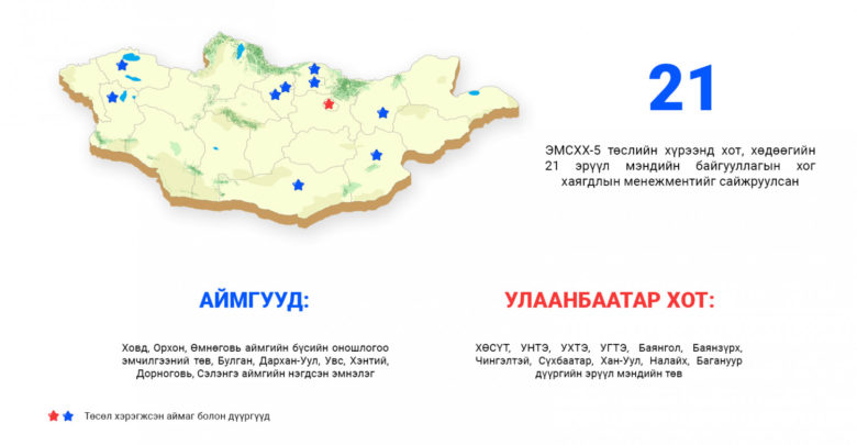 “Эрүүл мэндийн салбарын хөгжил хөтөлбөр-5” (ЭМСХХ-5) төслийн хүрээнд ХӨСҮТ, Улсын 1, 2, 3-р төв эмнэлэг, нийслэлийн Баянгол, Баянзүрх, Чингэлтэй, Сүхбаатар, Хан-Уул, Налайх, Багануур дүүргийн эмнэлгүүд, Ховд, Орхон, Өмнөговь аймгийн бүсийн оношилгоо эмчилгээний төв, Булган, Дархан-уул, Увс, Хэнтий, Дорноговь, Сэлэнгэ зэрэг аймгийн нэгдсэн эмнэлэг, нийт 21 эрүүл мэндийн байгууллагын хог хаягдлын менежментийг сайжруулсан юм.
