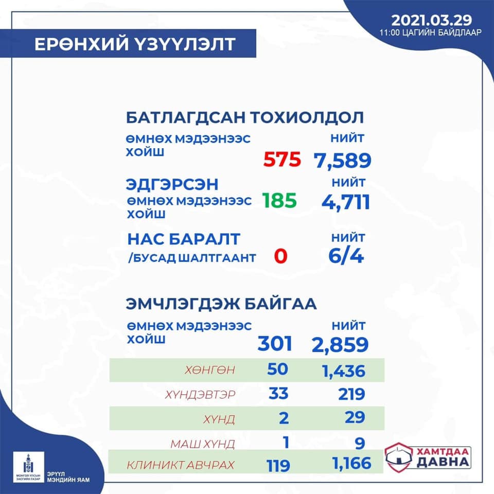 Ингэснээр улсын хэмжээнд нийт бүртгэгдсэн тохиолдлын тоо 7,589 боллоо. Өнгөрсөн 24 цагийн хугацаанд 185 хүн эдгэрч, эмнэлгээс гарав.