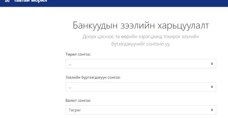 Иргэд, байгууллагууд www.mongolbank.mn/loanrate цахим холбоосоор орж, бүтээгдэхүүн сонгох цэснээс өөрийн хэрэгцээнд тохирох зээлийг сонгон, банкуудын санал болгож буй зээлийн нөхцөлүүдийг түргэн хугацаанд харьцуулан харах боломжтой юм.