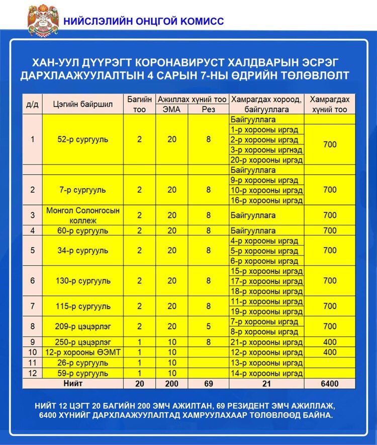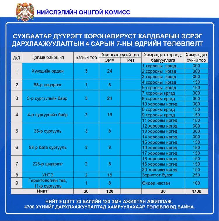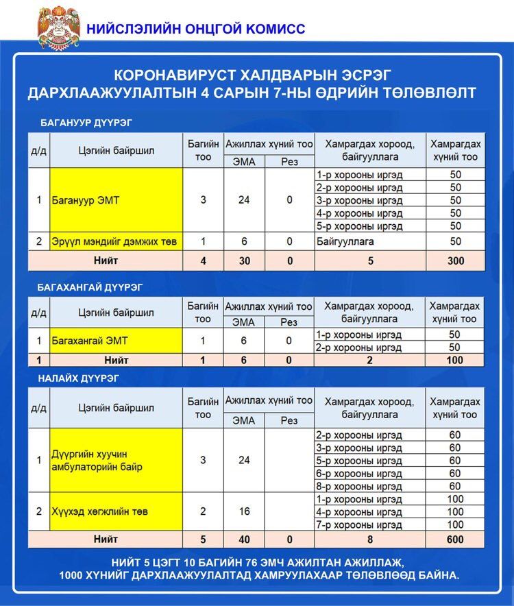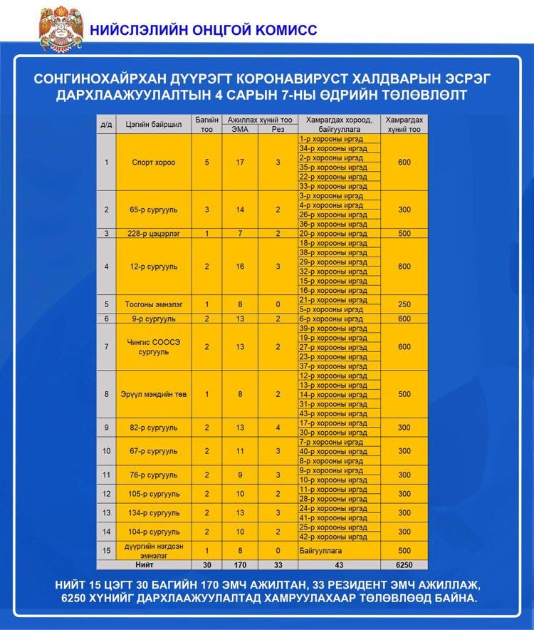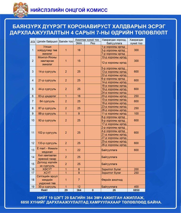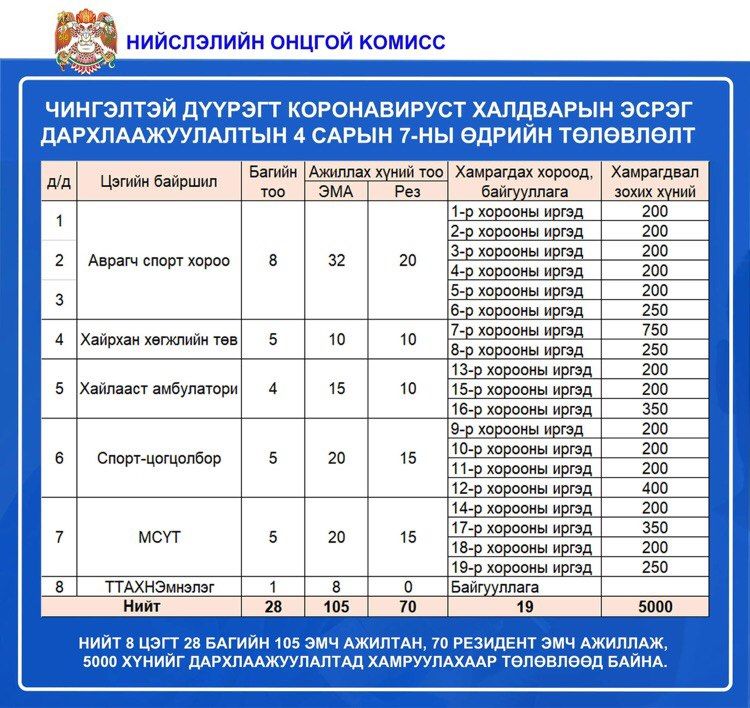 Өнөөдөр /2021.04.07/ нийслэлийн 9 дүүргийн 83 цэгт 1,513 эмнэлгийн ажилтан ажиллаж, 36,100 иргэнийг коронавирусийн эсрэг вакцинд хамруулахаар төлөвлөжээ.