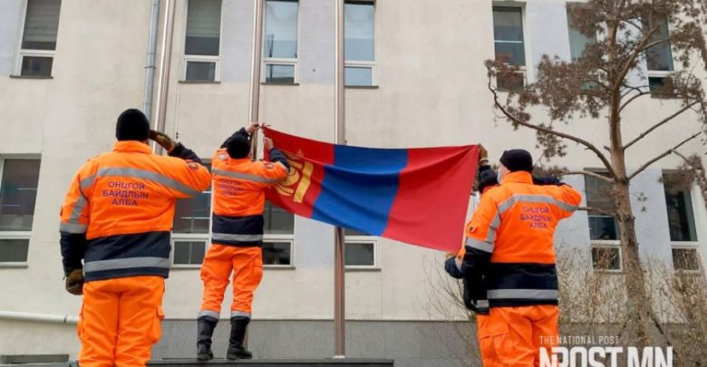 Төрийн далбаа буулгах ёслолыг Аврах ангийн Цэргийн алба шуурхай удирдлагын асуудал хариуцсан мэргэжилтэн, ахмад Ж.Бавуугарьд удирдан явууллаа. Дөрвөн эгнээ үүсгэн зогссон албан хаагчид командын дагуу хоёр эгнээ болов. Дараагаар нь 50 удаа гар дээр суниав. Хүн бүр зэрэг тоолж, нэгэн хэмнэлээр дээш доош болох нь сүрдэм. Ерөөс “Зэрэгц”, “Номхон” командын дагуу яралзтал хөдлөх залуусын жавхаа хаврын жихүүн салхийг зөөлрүүлэх шиг. Жагсаал дунд байгаа албан хаагчдын зарим нь олны нэрлэдгээр десант буюу эрээн цоохор хувцастай. Тэд бол өдрийн ээлжийн албан хаагчид. Тэдэн дунд ганц эмэгтэй зогсоо нь анхаарал татав. Түүнийг н.Мөнхтуяа гэх бөгөөд улсдаа ганц усчин аврагч юм. Ахлах дэслэгч О.Хосбаяр тэргүүтэй дөрвөн хүн жагсаалын талбайн зүүн зүгийн тэнгэрт намирах төрийн далбааны тийш алхахтай зэрэгцэн Монгол Улсын төрийн дуулал эгшиглэж эхлэв. Энэ үеэр дэслэгч “Ченж” хэмээх нохой хүч түрэн хуцах нь сонстоно. Тэр эрэл, нурангиас аврах ажиллагаанд ашигладаг мөрч нохой юм. Далбааг тун хүндэтгэлтэй буулгадаг аж. Албан хаагчид дэргэд нь очмогцоо цэх зогсон ёсолж, өндрөөс доошлох далбааны тэгш хэмийг алдагдуулахгүйн тулд хоёр талаас нь тэнийлгэн барьж харагдана. Буулгасан далбааг дөрвөн талаас нь нямбайлан эвхэж, нэг нь эрхэмлэн тэвэрч, ахлах дэслэгчийн командын дагуу ангийн байр руу гүйв.