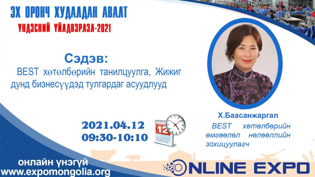 Үзэсгэлэн, семинар 30 хоног үргэлжлэх бөгөөд өнөөдөр Жижиг, дунд бизнесүүдэд тулгардаг асуудлууд, Компанийн засаглалын тухай ойлголт сэдвээр BEST хөтөлбөрийн өмгөөлөл, нөлөөллийн зохицуулагч Х.Баасанжаргал, мөн тус хөтөлбөрийн компанийн засаглалын төлөөлөгч П.Амармэнд нар мэдээлэл өгнө.
