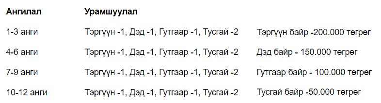 - Шалгаруулах ангилал, шагнал урамшуулал: