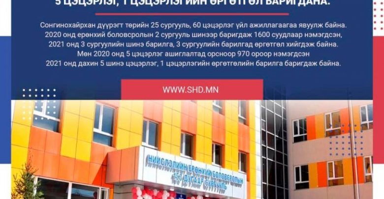 Сонгинохайрхан дүүрэгт 2021 онд шинээр гурван сургууль, гурван сургуулийн өргөтгөл, таван цэцэрлэг, нэг цэцэрлэгийн өргөтгөл барихаар төлөвлөжээ.