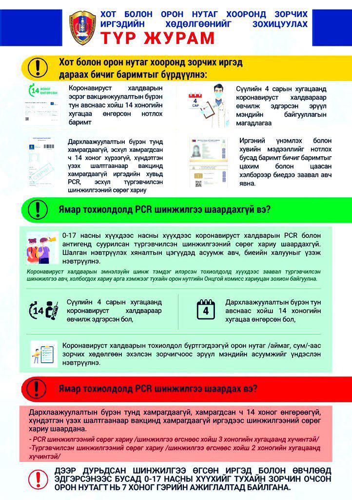 0-17 хүртэл насны хүүхдээс шинжилгээний хариу шаардахгүй, тухайн очсон газартаа гэрийн тусгаарлалтад долоо хоног байхыг шаардана. Өмнөговь, Дорноговь аймаг руу зайлшгүй шаардлагаар зорчих иргэд Аймгийн онцгой комиссын зөвшөөрлийн дагуу дээрх шаардлагуудыг хангасан тохиолдолд зорчино. Энэхүү хязгаарлалт 2021 оны 06 дугаар сарын 15-ны өдөр хүртэл үргэлжилнэ.
