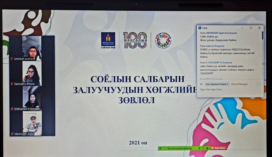 Түүнчлэн гадаадын улс орнуудад ажиллаж, амьдарч буй салбарын залуучуудын төлөөллүүдээс хилийн чанад дахь соёлын салбарын залуучуудын хөгжлийн зөвлөлийг байгуулах асуудлаар Швед, Япон, Австрали, Солонгос, Австри, Польш, ОХУ, АНУ, Канад зэрэг улсуудад ажиллаж, амьдарч буй 20 гаруй залуучууд цахим уулзалт хийв.