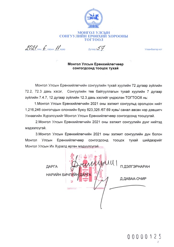 Уг шийдвэрийг Монгол Улсын Ерөнхийлөгчийн 2021 оны ээлжит сонгуулийн дүнгийн хамт танилцуулж байна.