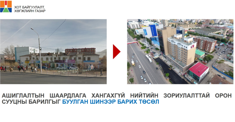 Түүнчлэн Нийслэлийн Засаг даргын 17 удаагийн захирамжаар 170 барилгыг буулган, дахин төлөвлөлтөд оруулж, барилгажуулах тухай шийдвэр гарсан байдаг. Уг шийдвэрийн дагуу төсөл хэрэгжүүлснээр 531 айлын 27 орон сууцыг буулгаж, 1556 айлын 13 орон сууцыг шинээр ашиглалтад оруулж, 215 айлыг эрүүл, аюулгүй орчинд амьдрах нөхцөлөөр хангасан.
