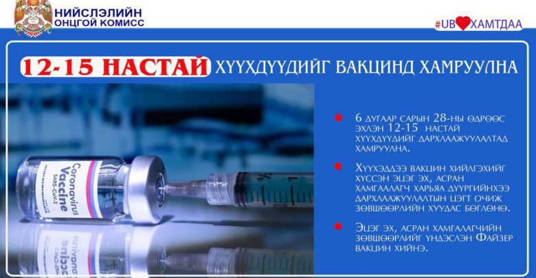 Эрүүл мэндийн сайдын тушаалаар өнөөдрөөс /2021.06.28/ 12-15 насны хүүхдүүдийг дархлаажуулалтад хамруулж эхэллээ. Дархлаажуулалтад хамрагдах хүүхдүүдэд Файзер үйлдвэрийн вакцин хийх юм. Ингэхдээ тухайн хүүхдийн эцэг эх, асран хамгаалагчийн зөвшөөрлөөр сайн дурын үндсэн дээр дархлаажуулалтад хамруулах юм.
