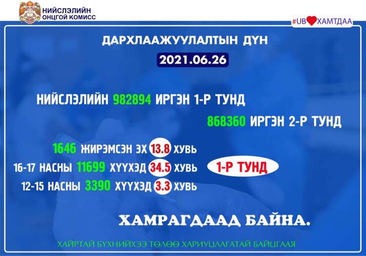 Вакцинжуулалт эхэлснээс хойш нийслэлийн 18-аас дээш насны 994.186 иргэн I тунд, 877.379 иргэн II тунд хамрагдлаа. Мөн нийт 1768 (14.8 хувь) жирэмсэн эх, 12-15 насны 3390 (3.3 хувь), 16-17 насны 11699 (34.5 хувь) хүүхэд тус тус дархлаажуулалтад хамрагдаж, вакцины I тун хийлгээд байна.