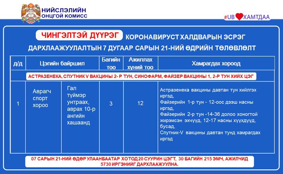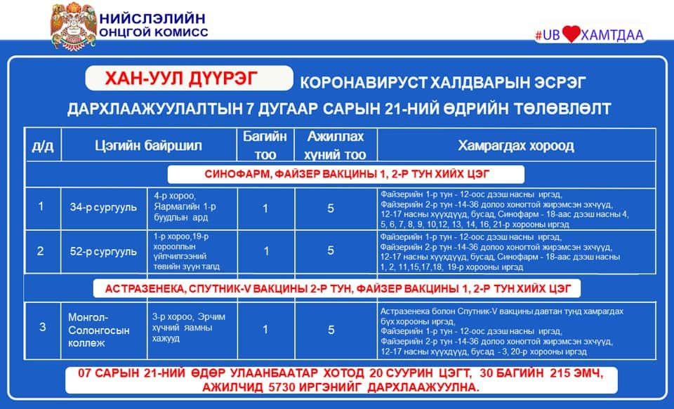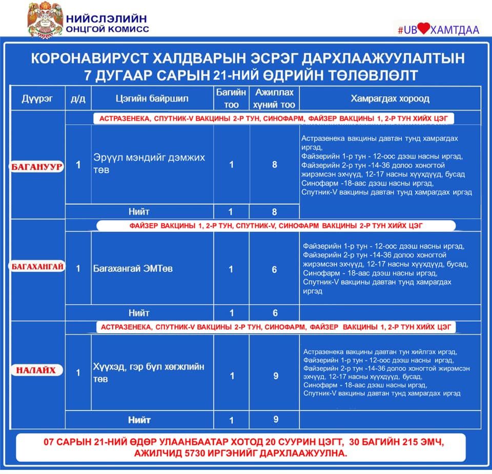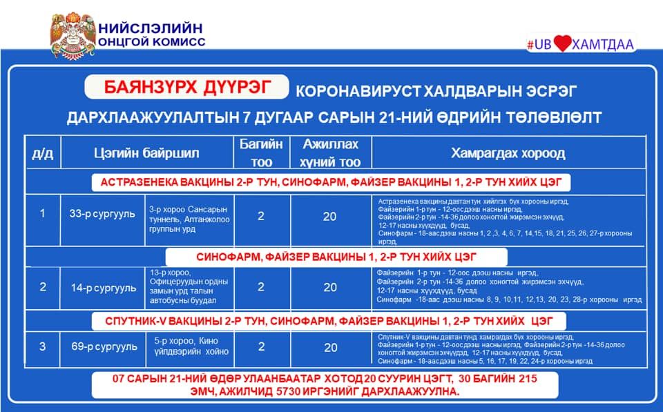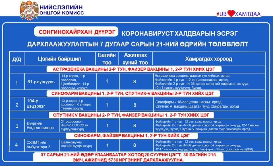 Улаанбаатар хотод өнөөдөр суурин 20 цэгт 5,730 иргэнийг дархлаажуулахаар төлөвлөсөн байна. Дархлаажуулалтын цэгүүдэд 30 багийн 215 эмч, ажилтан ажиллах юм. Дархлаажуулалтын цэгүүдийг дүүрэг тус бүрээр танилцуулъя.