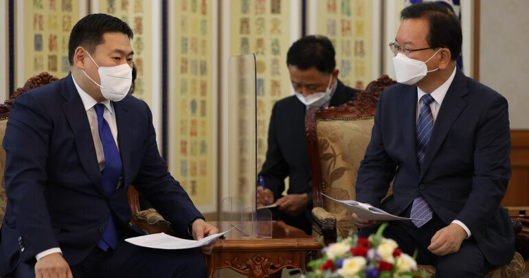 Монгол Улсын Ерөнхий сайд Л.Оюун-Эрдэнэ Япон Улсад ажлын айлчлал хийж, Токиогийн Олимпын наадмын нээлтийн ажиллагаанд оролцоод буцах замдаа БНСУ-аар дамжин өнгөрч байна. Тэрээр БНСУ-ын Ерөнхий сайд Ким Бү Гём-тэй өнөөдөр ажлын уулзалт хийв.