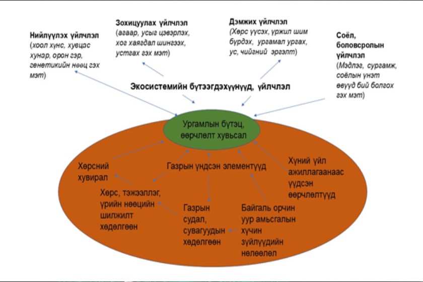 Газрын үндсэн 5 элементүүдийн харилцан үйлчлэл ургамлын аймгийн бүтэц, өөрчлөлт, экосистемийн үйлчлэлийн төлөв байдал, тэнцвэрийг тодорхойлж байдаг.