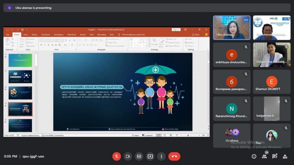 Энэ хүрээнд өнөөдөр Эх хүүхдийн эрүүл мэндийн үндэсний төвийн нийт эмч, мэргэжилтнүүдэд ЭМД-ын тухай хуульд орсон нэмэлт өөрчлөлтүүд, иргэдэд үзүүлсэн эрүүл мэндийн тусламж, үйлчилгээний санхүүжилт нэхэмжлэх, оношийн хамааралтай бүлэг, өртгийн жинг тооцох зэрэг сэдвийн хүрээнд цахим сургалтыг зохион байгууллаа.