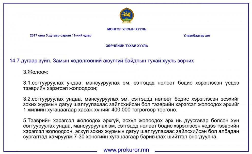 Дээрх хугацаанд Зөрчлийн тухай хуульд заасны дагуу 164128 хүн шийтгүүлсэн нь өмнөх сараас 1 хувиар, 191 хуулийн этгээд шийтгүүлсэн нь 36 хувиар тус тус буурсан байна. Зөрчил үйлдсэн хүмүүсийн 80 хувь нь эрэгтэй, 20 хувь нь эмэгтэйчүүд байгаа бол 39.4 хувь нь 26-35 насныхан, 27.3 хувь нь 36-45 насныхан байна.