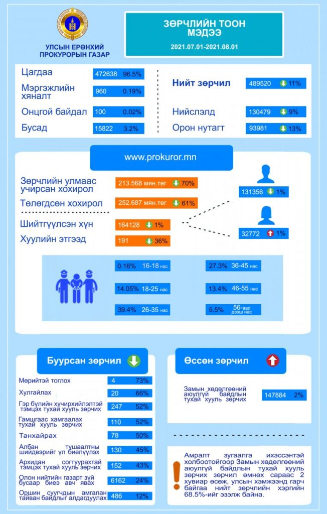 Өнгөрөгч 7 дугаар сард нийт 489520 зөрчлийн хэрэг бүртгэгдсэн нь өмнөх 6 дугаар сартай харьцуулахад 11 хувиар буурсан. Зөрчил үйлдэгдсэн нутаг дэвсгэрээр авч үзвэл 130479 зөрчлийн хэрэг Нийслэлд үйлдэгдэж өмнөх сараас 9 хувиар, орон нутагт 93981 зөрчлийн хэрэг үйлдэгдсэн нь өмнөх сараас 13 хувиар буурсан байна.