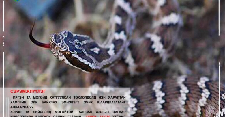 Хэрэв та нийслэлд хортой могойтой таарвал ажлын цагаар Нийслэлийн байгаль орчны газрын 318003, 323780 утсанд, бусад үед Нийслэлийн шуурхай удирдлагын төвийн 310005 тоот утсаар мэдээлэл өгнө үү.