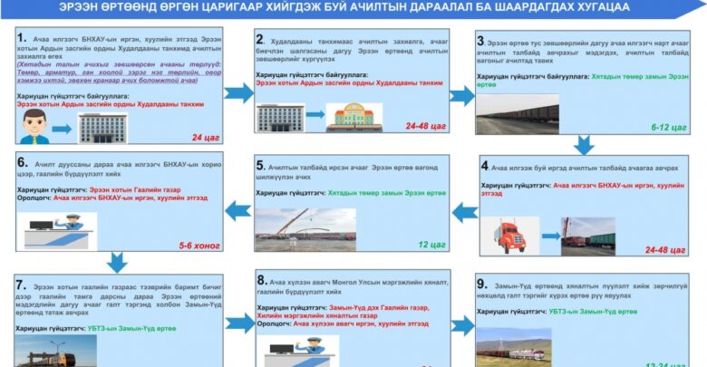 БНХАУ-ын Эрээн өртөөнөөс ачаагаа ачуулах хүсэлтэй аж ахуйн нэгж, байгууллагад тус өртөөний өргөн царигийн төмөр зам дээр вагонд ачаа ачиж тээвэрлүүлэх үйл ажиллагааны дараалал болон шаардагдах хугацааны мэдээллийг тайлбартайгаар хүргэж байна.