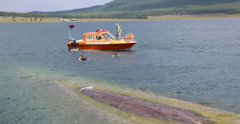 Аврагчид Сүхбаатар хөлөг онгоцны байрлал, онцлогыг судалж, шумбалт хийж дүрсжүүлэн, татан гаргах зам, маршрутыг судлан ажиллаж байна.