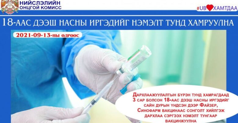 Коронавируст халдварын эсрэг дархлааны түвшнийг нэмэгдүүлэх зорилгоор өнөөдрөөс эхлэн 18-аас дээш насны иргэдийг нэмэлт гурав дахь тунгаар вакцинжуулахаар боллоо.