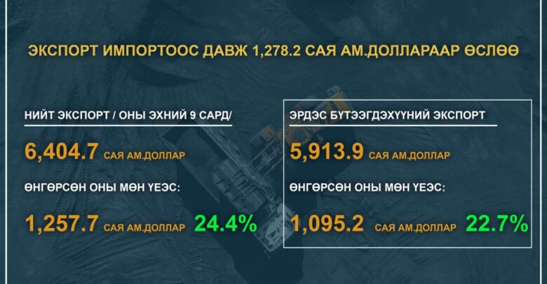 Нийт экспорт оны эхний 9сарын байдлаар 6,404.7сая ам.долларт хүрч өнгөрсөн оны мөн үеэс 1,257.7сая ам.доллар буюу 24.4хувиар өссөн. Үүнээс: Эрдэс бүтээгдэхүүний экспорт 5,913.9 сая ам.долларт хүрч өнгөрсөн оны мөн үеийн гүйцэтгэлээс 1,095.2сая ам.доллар буюу 22.7хувиар өсжээ.