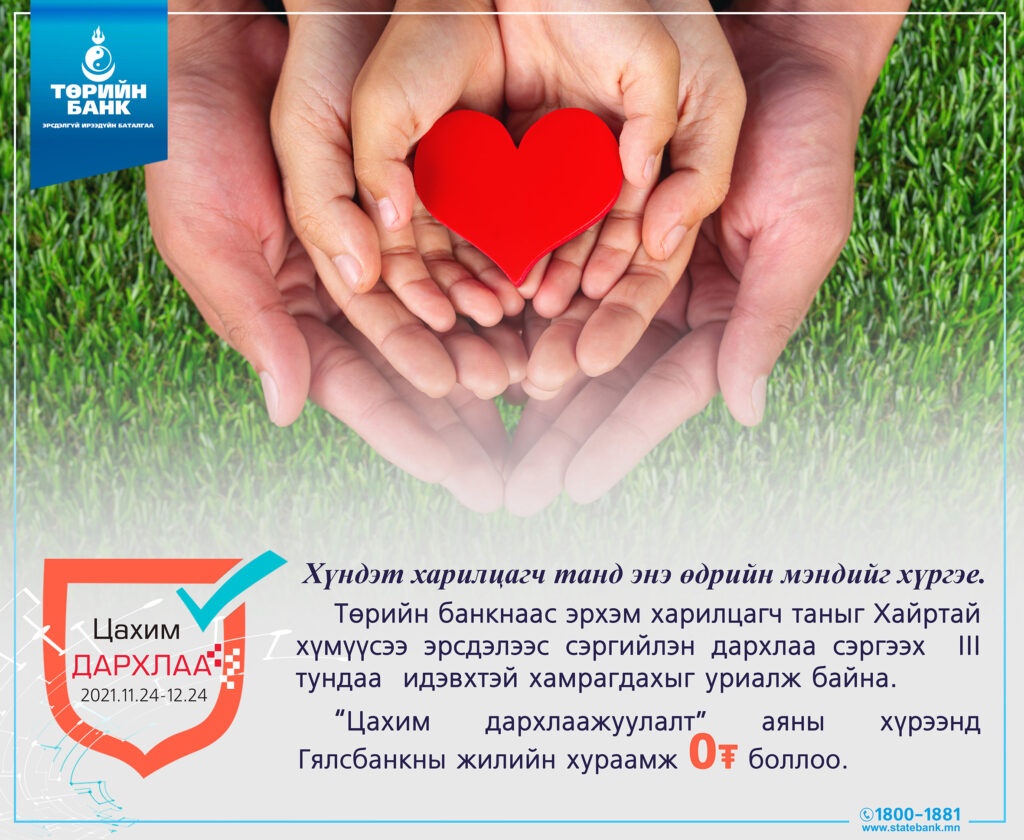 Төрийн банк эрхэм харилцагч таныг КОВИД-19 цар тахлын эсрэг вакцины III тундаа хамрагдахыг уриалж “Цахим дархлаажуулалт”-ын аянаа зарлаж байна. Тус аяны хүрээнд бид орон даяар байрлах 500 гаруй салбар нэгжээрээ дамжуулан 2021 оны 11 дүгээр сарын 24-нөөс 12 дугаар сарын 24-нийг дуустал хугацаанд III тунд хамрагдсан бол Гялсбанкны жилийн хураамжаас чөлөөлж байна.