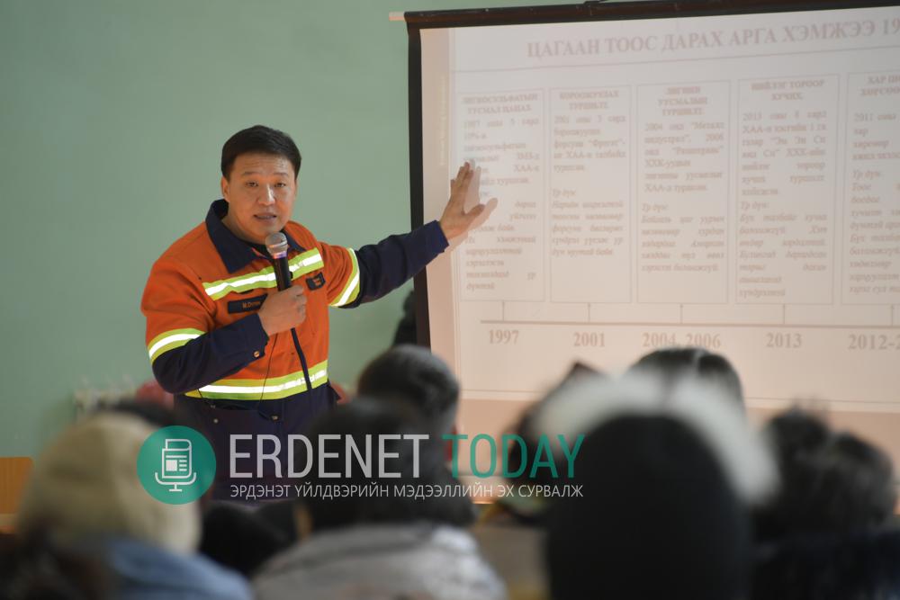 “Эрдэнэт үйлдвэр” ТӨҮГ-ын Баяжуулах үйлдвэрийн дарга М.Отгон болон Байгаль орчин, ногоон хөгжлийн хэлтсийн мэргэжилтнүүд Орхон аймгийн Жаргалант сумын иргэдэд цагаан тоосны дэгдэлт дарах чиглэлээр хийж байгаа ажлуудын талаар мэдээлэл өглөө.