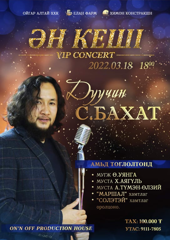 Үеийнхэн дундаа нарийн торгон мэдрэмжээрээ дууг урлан дуулж, хамгийн нандин мэдрэмжүүдийг сонсогчдод хүргэдэг дуучин болох С.Бахат “Ен Кеш” VIP тоглолтоо ON’N, OFF production house-ын тайзнаа тавих гэж байна. Тэрээр гарсан тайз бүртээ амьд хөгжим, амьд хоолойг хослуулан сонсогчиддоо өөрийн уран бүтээлээ толилуулдаг. “Ээждээ” хэмээх сонсогчдын чихэнд чимэг болсон Казакстаны уран бүтээлийг Монгол, Казах хэл дээр коверлон дуулснаар нь сонсогчид түүнийг эчнээ танина. Тэгвэл түүний “амьтай”, хүчтэй дуу хоолойг бие сэтгэлээрээ мэдрэх боломж С.Бахатыг сонсогчдод гуравдугаар сарын 18-нд олдох нь. С.Бахат дан ганц дуучнаар зогсохгүй ая зохиогч билээ. Дуучин А.Түмэн-Өлзийтэй хамтран дуулсан “Сэтгэл харагдана” дууны аяыг өөрөө зохиосон гэхээр ямар торгон мэдрэмжтэйг илэрхийлж байгаа юм. Ингээд С.Бахаттай уран бүтээл болон тоглолотынх нь талаар ярилцсанаа хүргэе.