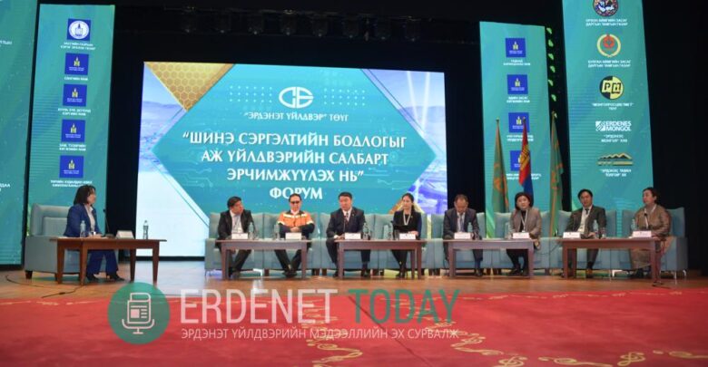 Монгол Улсын Засгийн газраас хэрэгжүүлж буй Шинэ сэргэлтийн бодлогыг аж үйлдвэрийн салбарт эрчимжүүлэх ажлыг Эрдэнэт үйлдвэр эхлүүллээ. Монголын уул уурхайн анхдагч, жишиг үйлдвэр төдийгүй хөгжлийн түүчээ нь болж ирсэн Эрдэнэт үйлдвэрт шинэ сэргэлтийн бодлого илүү тод тусгалаа олохоор харагдаж байна. Нэмүү өртөг шингэсэн уул уурхайн бүтээгдэхүүний хэмжээг дээшлүүлэн эрдэс баялгийн баталгаат нөөцийг арвижуулахаар тусгасан Шинэ сэргэлтийн бодлогын аж үйлдвэржилтийн цөм нь зэсийн баяжмал боловсруулах үйлдвэр барьж байгуулах. Энэ нь Эрдэнэт үйлдвэрийг 2031 он хүртэл хугацаанд хөгжүүлэх үндсэн чиглэлийн үйл ажиллагаатай яв цав нийцэж, илүү боломжийг нээж, эрх зүйн орчныг бүрдүүлж байгаа юм. Тийм ч учраас “Эрдэнэт үйлдвэр” ТӨҮГ “Шинэ сэргэлтийн бодлогыг аж үйлдвэрийн салбарт эрчимжүүлэх нь” форумыг санаачлан зохион байгуулж, хөгжлийн томоохон төсөл хөтөлбөр, их бүтээн байгуулалтууд, хөрөнгө оруулалт, худалдан авалт, төр, хувийн хэвшлийн хамтын ажиллагаа, хууль эрх зүйн шинэчлэл, нийгэм, эдийн засгийн олон чухал асуудлын талаар хэлэлцүүлэг өрнүүллээ. Өнгөрсөн баасан гарагт болсон энэхүү форумд Уул уурхай, хүнд үйлдвэрийн яам, Сангийн яам, Эдийн засаг, хөгжлийн яам, Хууль зүй, дотоод хэргийн яам, Зам, тээврийн хөгжлийн яам, Төрийн өмчийн бодлого, зохицуулалтын газар, Авилгатай тэмцэх газар, Мэргэжлийн хяналтын Ерөнхий газар, Төрийн худалдан авах ажиллагааны газар, Монголын үндэсний худалдаа аж үйлдвэрийн танхим болон төр, хувийн хэвшлийн 300 орчим төлөөлөл оролцсон юм.