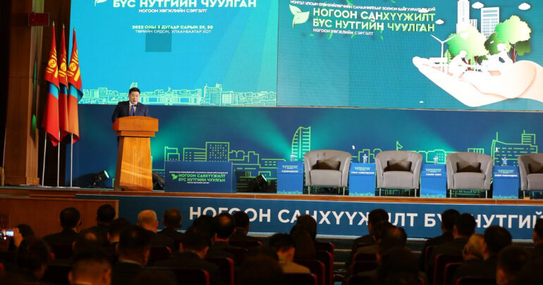 Монгол Улсын Ерөнхийлөгчийн ивээл дор “Ногоон санхүүжилт-Бүс нутгийн чуулган” Төрийн ордонд эхэллээ. Чуулган нь Үндэсний тогтвортой санхүүжилтийн замын зураг гаргаж батлах, ногоон санхүүжилтийг дэмжих, уур амьсгалын өөрчлөлтийг сааруулах, цөлжилт, шар шороон шуургатай тэмцэх чиглэлээр бүс нутгийн уриалга гаргах, ирэх сарын эхээр болох “Монголын эдийн засгийн форум-2022”-ын нэгдсэн хуралдаанд санал, зөвлөмжөө танилцуулах зорилготой юм.