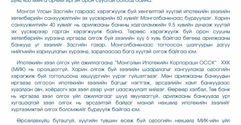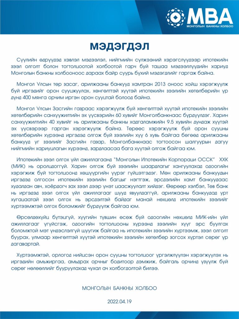 Сүүлийн өдрүүдэд хэвлэл мэдээлэл, нийгмийн сүлжээний хэрэгслүүдээр ипотекийн зээл олголт болон тогтолцоотой холбоотой гарч буй ташаа мэдээллийн хариуд Монголын банкны холбооноос дараах байр суурь бүхий мэдэгдлийг гаргажээ.