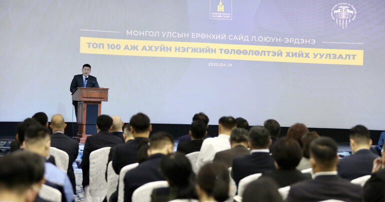 Монгол Улсын Ерөнхий сайд Л.Оюун-Эрдэнэ Топ-100 аж ахуйн нэгжийн төлөөлөлтэй МҮХАҮТ-д уулзлаа. Засгийн газар 2022 оны улсын төсвийг тодотгохоор УИХ-д хуулийн төсөл өргөн мэдүүлэхээр боловсруулж байна. Ерөнхий сайд тодотголын төслийг бизнес эрхлэгчдэд танилцуулж, саналыг нь сонслоо.