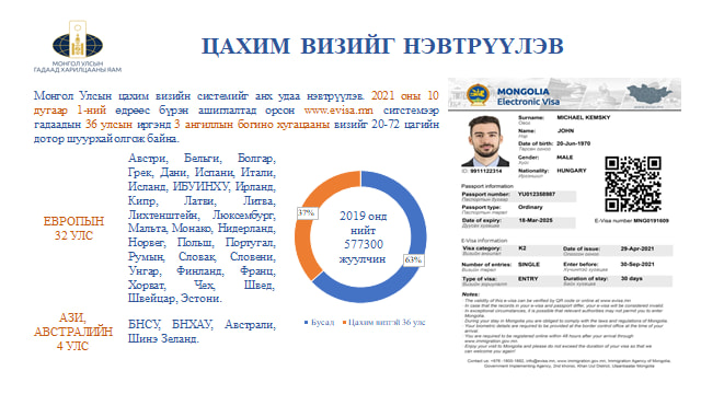 Монгол Улс цахим визийн www.evisa.mn системийг 2021 оны 10 дугаар сарын 01-ний өдрөөс нэвтрүүлж, ашиглалтад оруулсан.