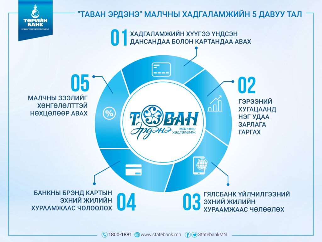 Төрийн банк хуримтлалтай дундаж давхаргыг дэмжих зорилтын хүрээнд малчин өрхүүддээ зориулан буянт малынхаа хишгийг хуримтлуулж, өрхийн санхүүдээ тодорхой хэмжээгээр мөнгөн орлогоо нэмэгдүүлэх боломжтой, онцгой урамшуулалт нөхцөл бүхий “Таван эрдэнэ” хадгаламжийг зах зээлд нэвтрүүллээ.