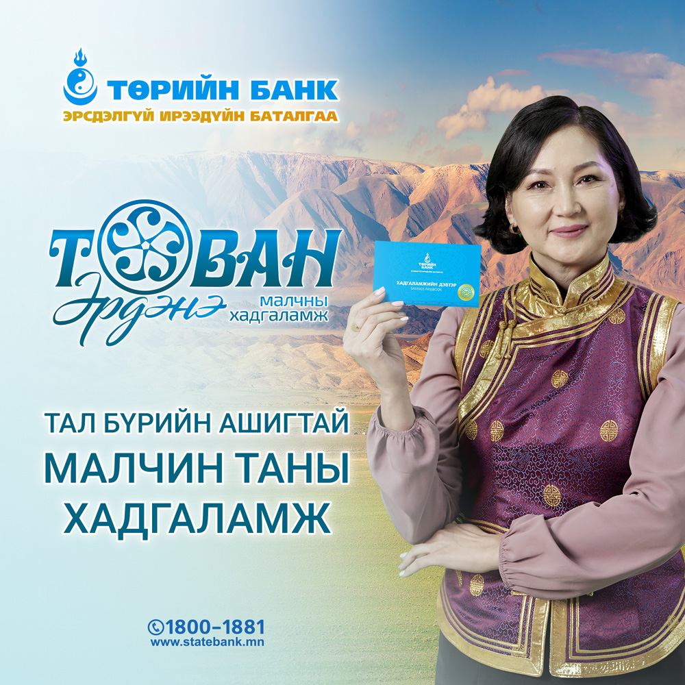 Та тал бүрийн ашигтай “Таван эрдэнэ” хадгаламжийг Төрийн банкны орон нутгийн салбар нэгж дээр иргэний бичиг баримттайгаа ирж нээлгэн, эрдэнэт малынхаа хишгийг хуримтлуулан арвижуулаарай.