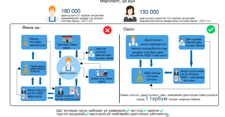 Даатгуулагч, иргэн Та www.e-mongolia.mn болон www.ndaatgal.mn -ээр хүсэлт гаргаж хөдөлмөрийн чадвар түр алдсаны, жирэмсний болон амаржсаны тэтгэмжээ цахимаар авах боломжтой.