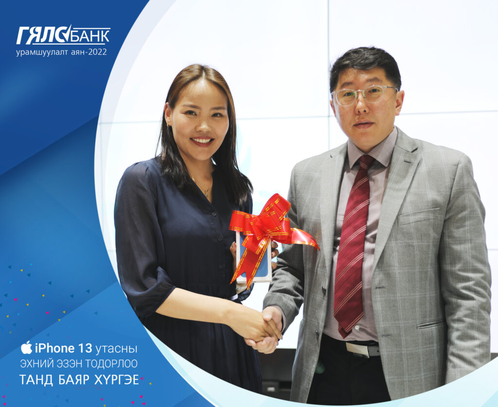 Аяны хүрээнд “Гялсбанк”-аар сард зургаагаас дээш гүйлгээ хийсэн харилцагчдын дундаас сар бүр нэг урамшууллын эзнийг тодруулах бөгөөд тавдугаар сарын урамшууллын эзнийг тодруулан iPhone13 гар утсыг гардуулан өглөө.