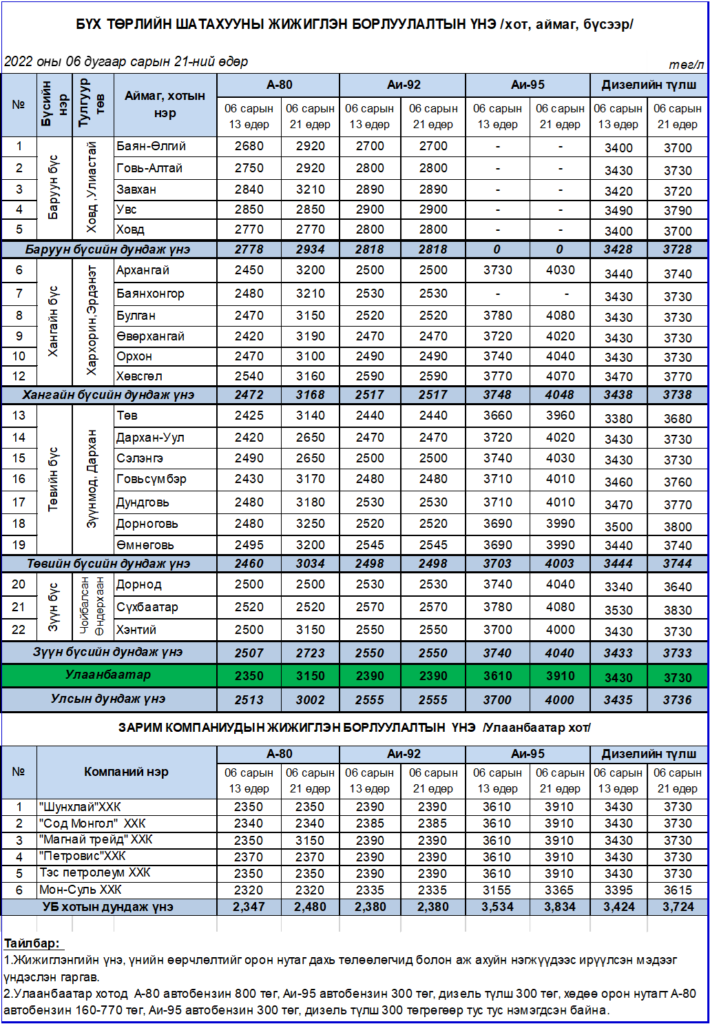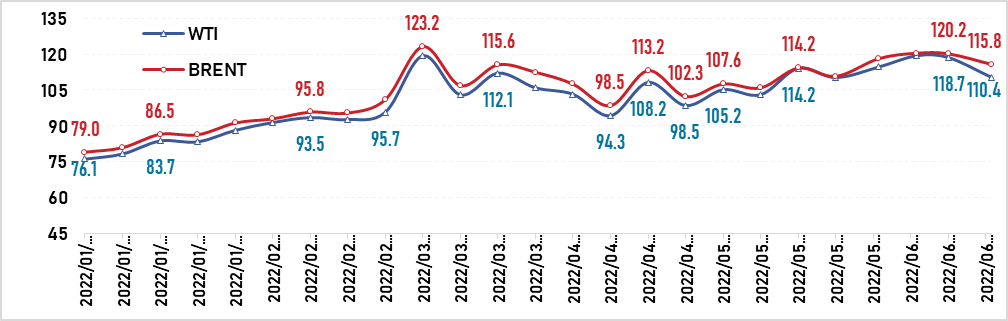 2022 оны 06 дугаар сарын 21-ний өдрийн хаалтын арилжаагаар “Брент” төрлийн газрын тосны үнэ 115.83 ам.доллар/баррель, “WTI” төрлийнх 110.42 ам.доллар/баррель ханштайгаар худалдаалагдсан нь өнгөрсөн долоо хоногийн үзүүлэлттэй харьцуулахад “Брент” төрлийн газрын тосны үнэ 3.6 хувиар, “WTI” төрлийн газрын тос 6.9 хувиар буурсан үзүүлэлттэй байна.