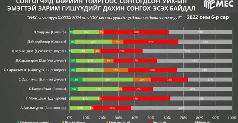 МЕС судалгааны байгууллагаас 2022 оны 6 сард УИХ-ын сонгуулийн зарим тойргуудад нэгэн сонирхолтой судалгааг хийжээ. Тодруулбал, ямар нэгэн нам, байгууллага, хувь хүний захиалгаар бус өөрийн санхүүжилтээр хийдэг уг судалгааг Баянгол дүүрэг, Сүхбаатар дүүрэг, Хан-Уул дүүрэг, Баянзүрх дүүргийн 22 дугаар тойрог, Сэлэнгэ аймаг, Завхан аймаг, Дундговь аймаг, Баянхонгор аймгаас сонгогодсон эмэгтэй гишүүдийг 2024 оны УИХ-ын сонгуульд нэр дэвшвэл дахин сонгох эсэх байдлаар явуулсан байна.