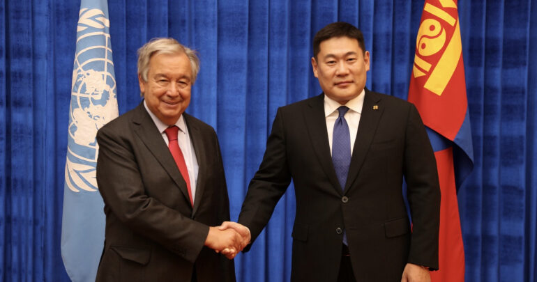 Монгол Улсын Ерөнхийлөгч У.Хүрэлсүхийн урилгаар НҮБ-ын Ерөнхий нарийн бичгийн дарга Антонио Гутерреш наймдугаар сарын 8-11-ний өдрүүдэд Монгол Улсад албан ёсны айлчлал хийж байна. Энэхүү айлчлалын хүрээнд Монгол Улсын Ерөнхий сайд Л.Оюун-Эрдэнэ НҮБ-ын Ерөнхий нарийн бичгийн дарга Антонио Гутеррешийг /2022.08.09/ хүлээн авч уулзлаа.