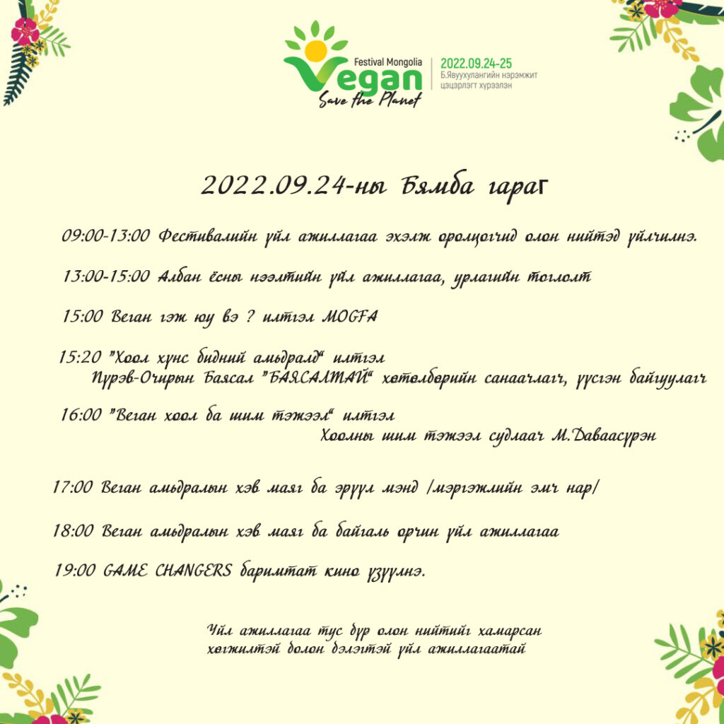 Хоёр өдөр үргэлжилсэн тус арга хэмжээг Чингэлтэй ЗДТГ, НЭМГ, Монголын органик ногоон хүнсний холбоо ТББ, Энэрэл МСҮТ болон веган хоол, үйлдвэрлэл, худалдаа үйлчилгээний чиглэлээр дагнан үйл ажиллагаа явуулдаг иргэд байгууллагууд болон амьтны эрх хамгаалах, байгаль орчин, амьсгалын өөрчлөлтийг бууруулах, хог хаягдлын чиглэлээр үйл ажиллагаа явуулдаг 30 орчим ТББ-ууд /2022.09.24-25/ хамтран зохион байгуулав.