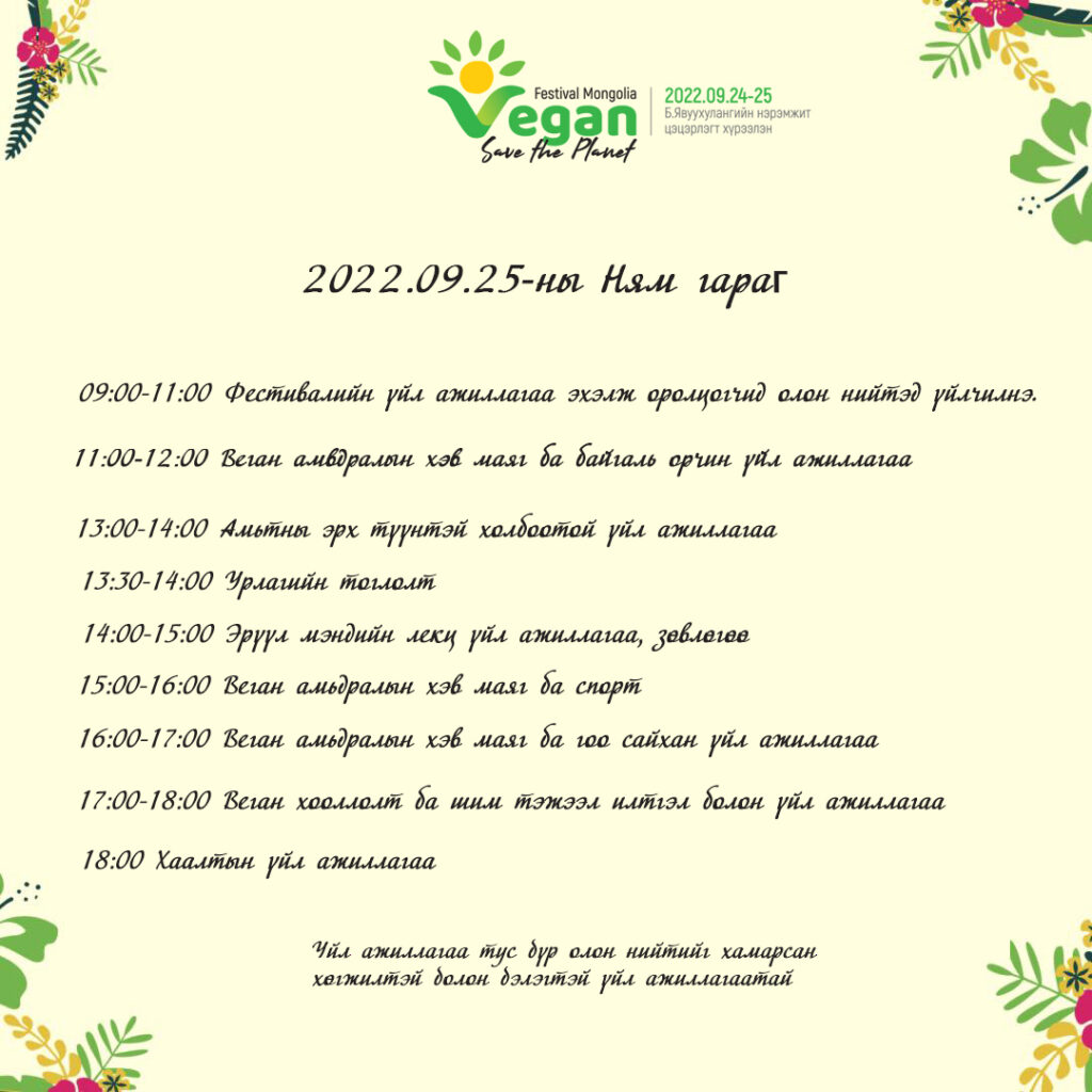 Дэлхийн улс орнууд хүрээлэн буй орчиндоо ээлтэй, ургамалд суурилсан хооллолтын хэв маягийг сурталчилан дэлгэрүүлэх зорилгоор жил бүр веган фестивалийг зохион байгуулдаг уламжлалтай. Тэгвэл Монгол Улсад анх удаа “Эх дэлхийгээ хамгаалъя” уриатай веган фестиваль өнөөдөр Дорны их яруу найрагч Б.Явуухулангийн цэцэрлэгт хүрээлэнд боллоо.