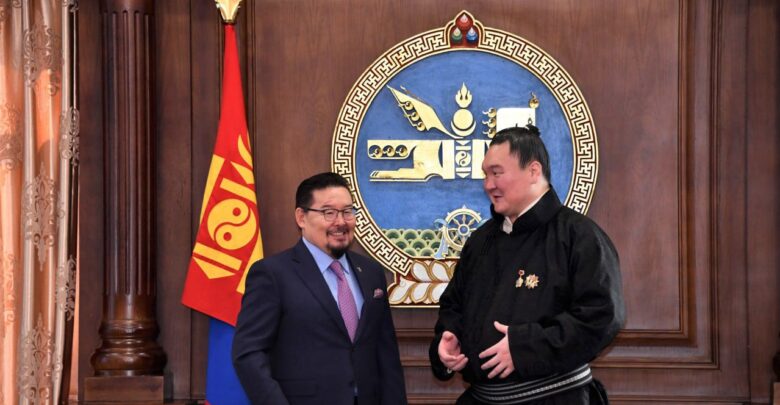 Монгол Улсын Их Хурлын дарга Г.Занданшатар (2022.10.12) Монгол Улсын Хөдөлмөрийн баатар, Гавьяат тамирчин, Японы мэргэжлийн сумогийн 69 дэх их аварга Хакухо М.Даваажаргалыг хүлээн авч уулзлаа.