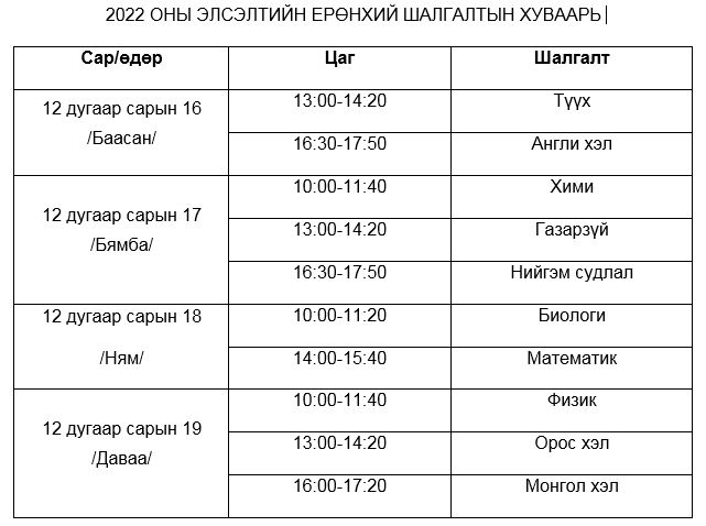 Боловсрол, шинжлэх ухааны сайдын 2022 оны А/47 тоот тушаалаар нэмэлт өөрчлөлт орсон “Оюутан элсүүлэх журам”-ын дагуу Элсэлтийн ерөнхий шалгалтыг жилд 2 удаа зохион байгуулахаар тусгагдсан. Энэ оны 2 дахь Элсэлтийн ерөнхий шалгалтыг 12 дугаар сарын 16-19-ний өдрүүдэд улсын хэмжээнд зохион байгуулагдах гэж байна.
