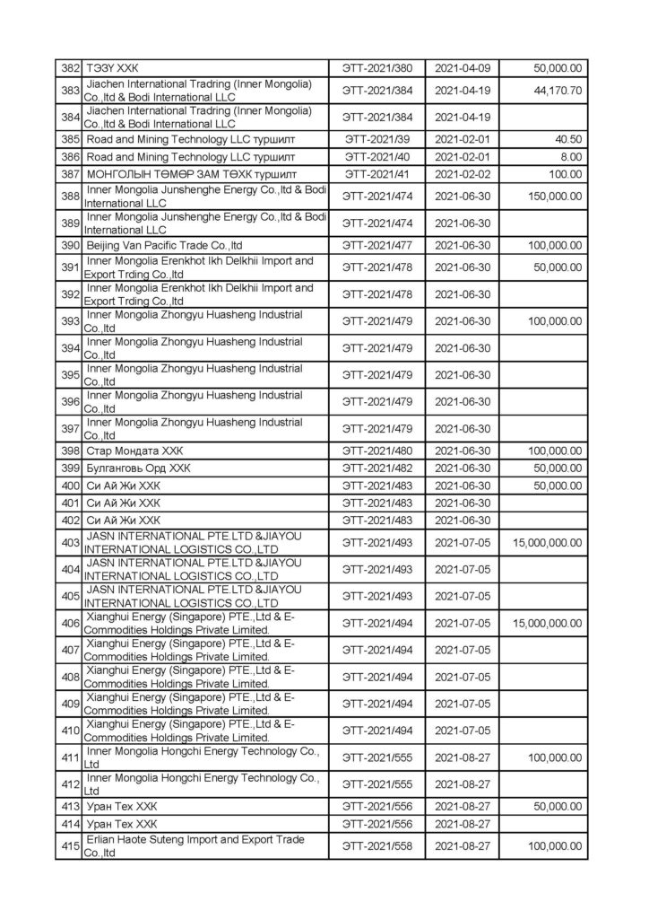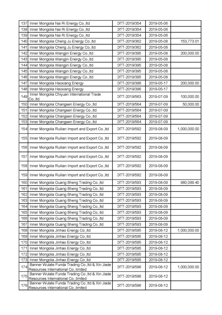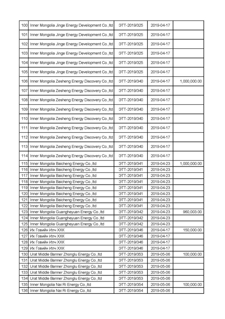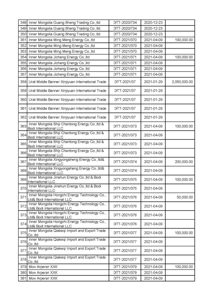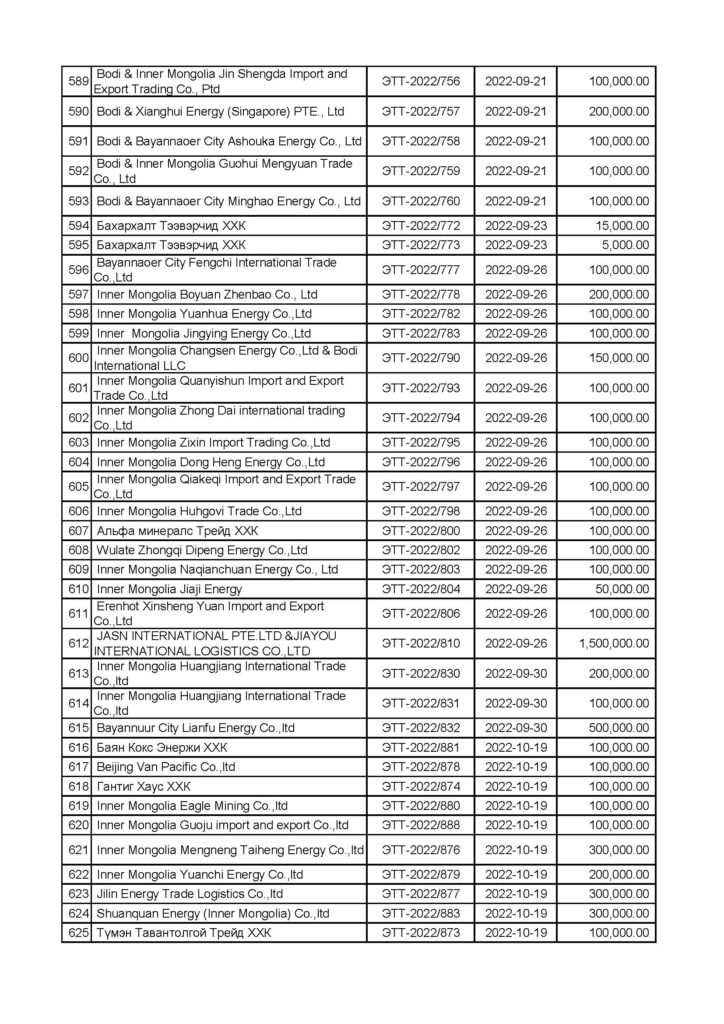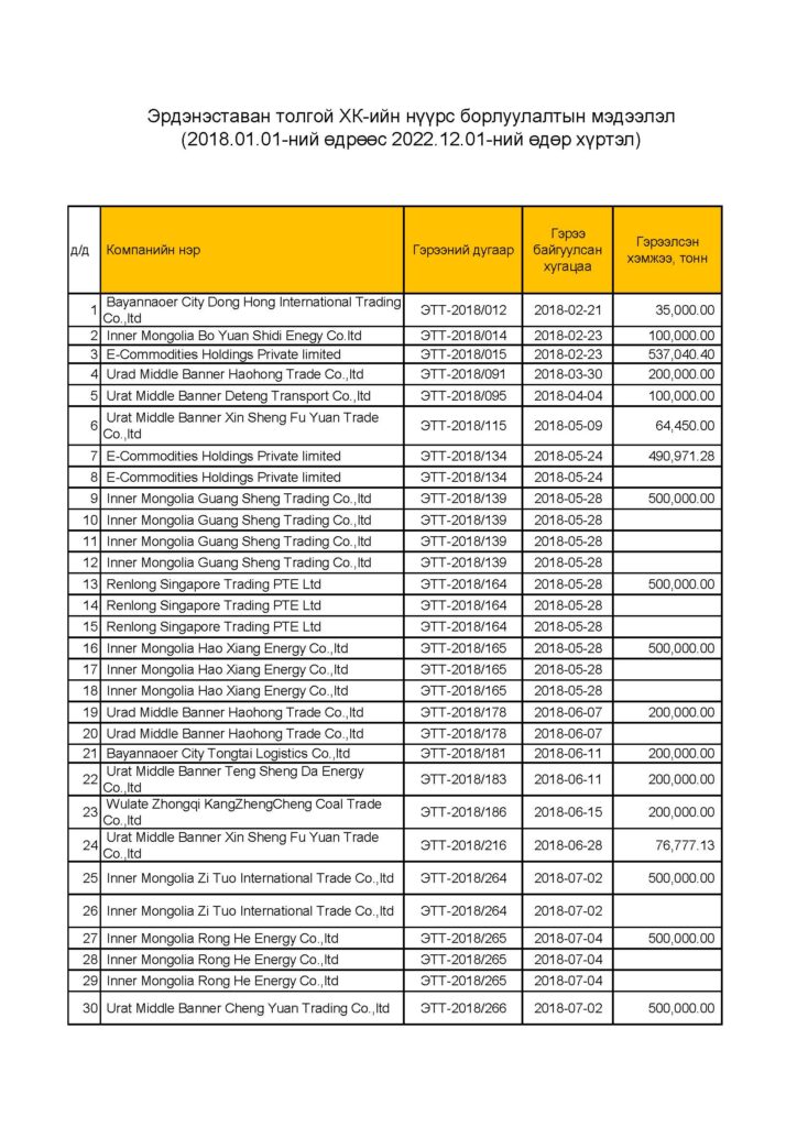 “Эрдэнэставан толгой” ХК-ийн нүүрс борлуулалтын мэдээлэл