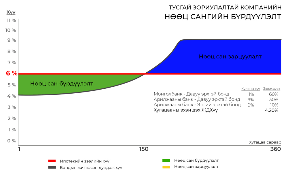 - Хугацааны эхэнд бондын хүүний дундаж зардал нь ипотекийн зээлийн хүүний орлогоос бага байх тул зөрүүгээр нөөц санг бүрдүүлнэ.