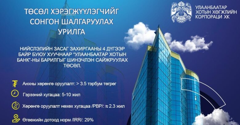 “Улаанбаатар хотын хөгжлийн корпораци” ХК нь төр, хувийн хэвшлийн түншлэлээр “Нийслэлийн Засаг захиргааны 4 дүгээр байрыг шинэчлэн сайжруулах” төслийг хэрэгжүүлэх зорилгоор Монгол Улсын болон гадаадын хуулийн этгээд/түншлэлийг төслийн сонгон шалгаруулалтад оролцохыг урьж байна.